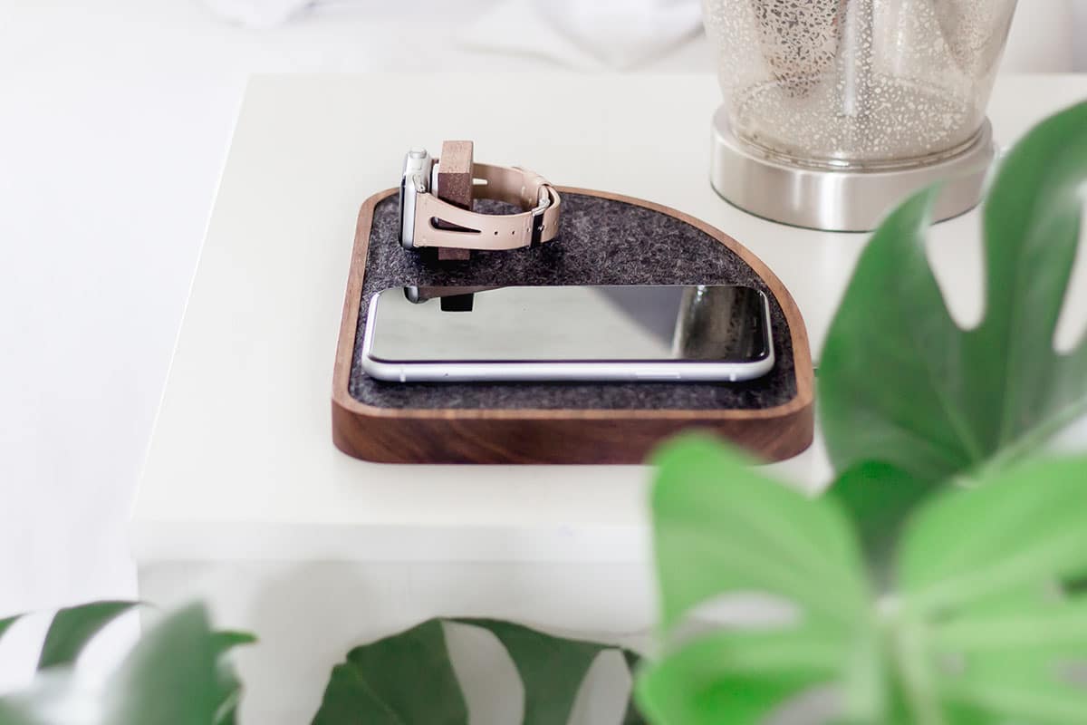 Perfect for your desk or nightstand, this sleek wireless charger works with any iPhone. A combination of walnut and synthetic felt add style, and the charger reduces the number of wires trailing everywhere.