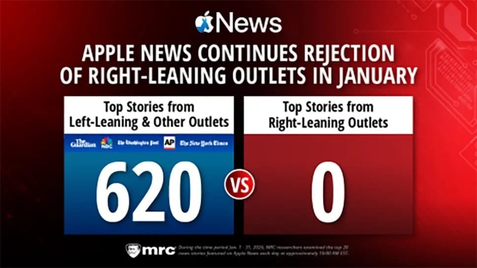 Appleās News app has been accused of aggressively promoting left-leaning outlets while effectively shutting out right-leaning publications from its most prominent placements, according to a Media Research Center (MRC) study.