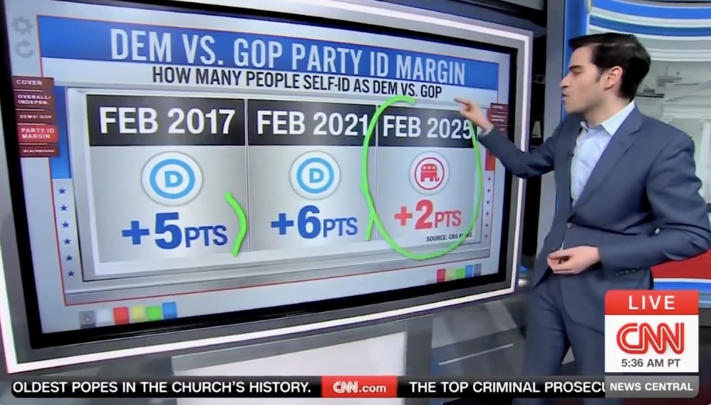 “But look at what’s happened in February of 2025. Look at this: Republicans, there are more Republicans in the electorate than there are Democrats. Republican plus two,” he continued. “So Donald Trump and the Republicans have remade the electorate. They’ve turned some people over from being Democrats or independents to become Republicans. New folks have entered the electorate who are more Republican leaning.”