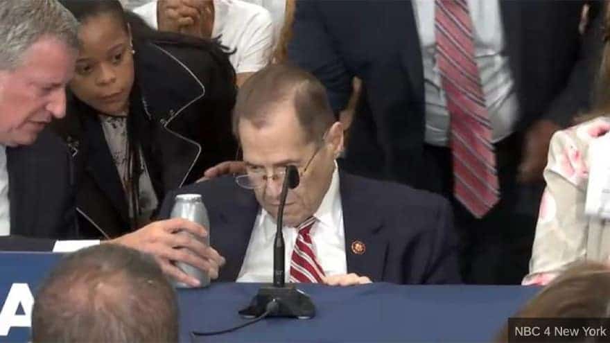 “Chairman of the House Judiciary Committee Jerry Nadler appeared weak and on the verge of passing out at a presser held by Mayor Bill de Blasio Friday morning,” reports NBC New York. “Video from the press conference at P.S. 199 shows de Blasio and others coming to Nadler’s aid offering water and asking him if he was OK.”