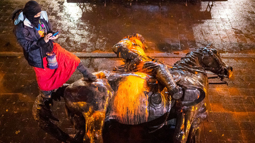 “The report said the Roosevelt statue fell at about 8:51 p.m., local time, and the Lincoln statue fell about eight minutes later in Portland’s South Park Block. The paper said the police did not intervene,” reports Fox News.