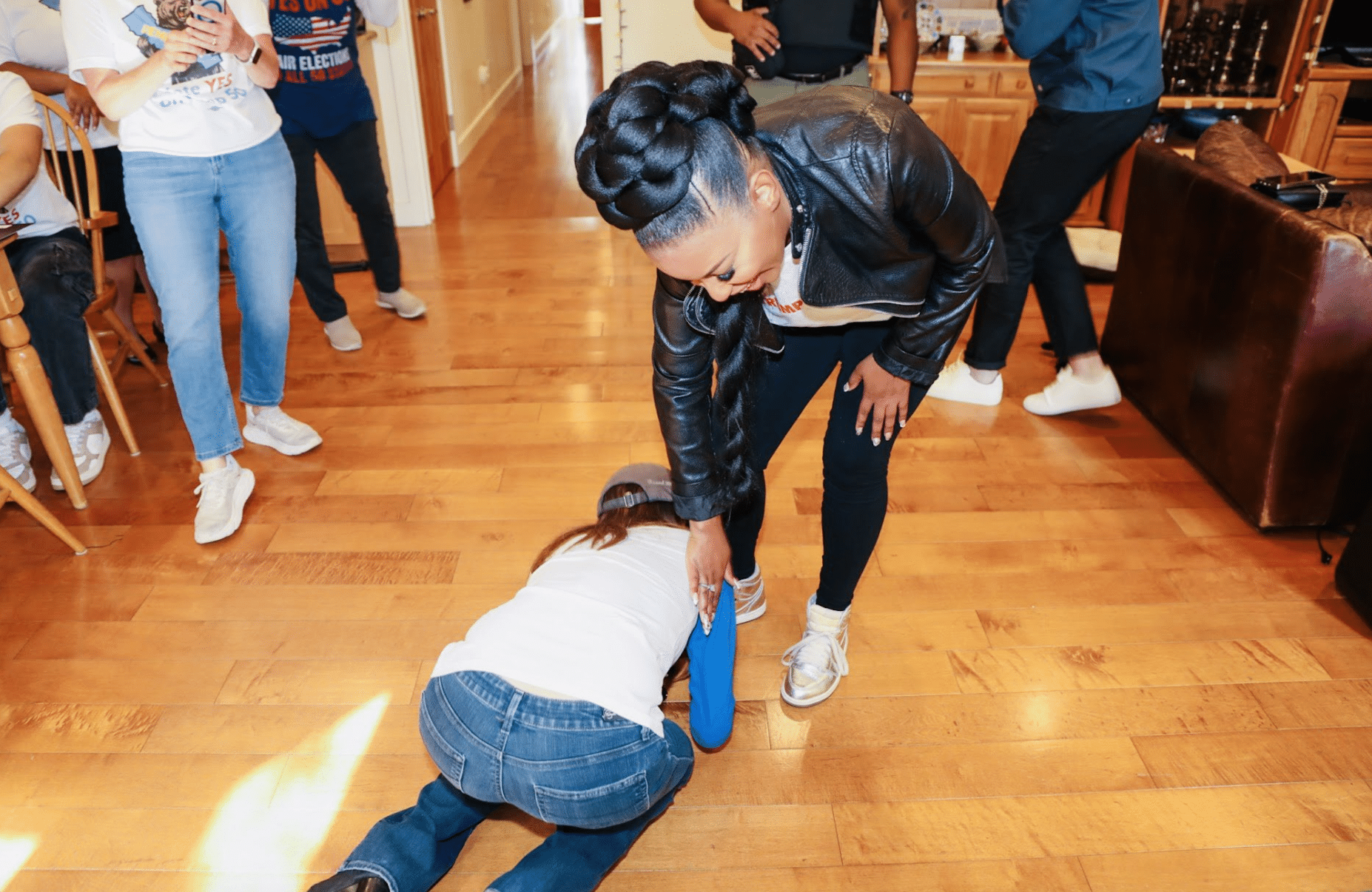 NEW: Radio show host Stephanie Miller kisses the feet of Democrat Rep. Jasmine Crockett.