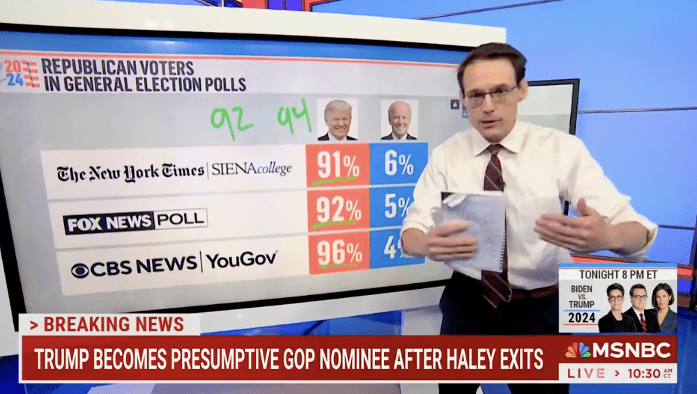 “If you’re looking at the primaries and saying there’s all this evidence of Republicans turning on Trump in the fall, you’re not seeing it in the general election polling,” Kornacki says.