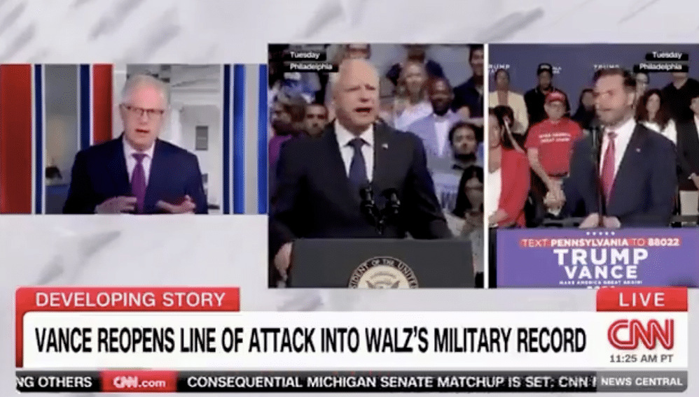 CNN: "[Tim] Walz did make a comment…he’s done it a couple times, where he has used language that has suggested that he carried weapons in a fighting situation…There is no evidence that any time that Gov. Walz was in the position of being shot at and some of his language could… pic.twitter.com/f3W6D3ZsIX