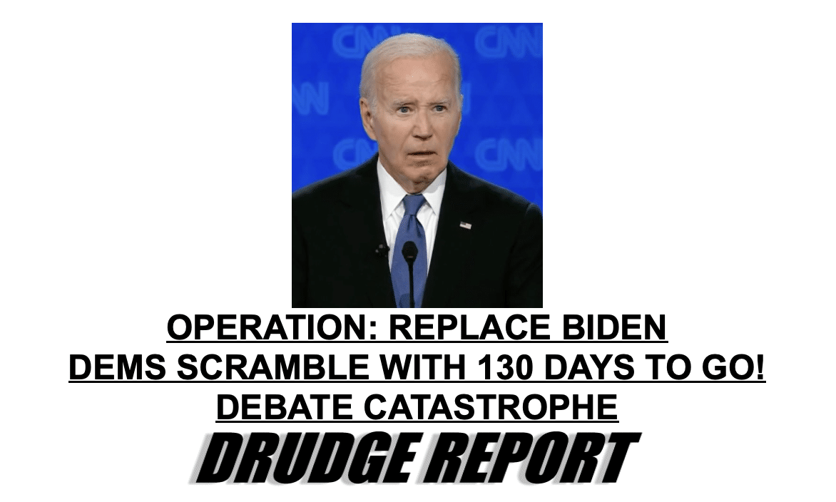 The front page of popular news site Drudge Report had the following headlines: Operation Replace Biden, Dems Scramble with 130 Days to Go, and Debate Catastrophe.