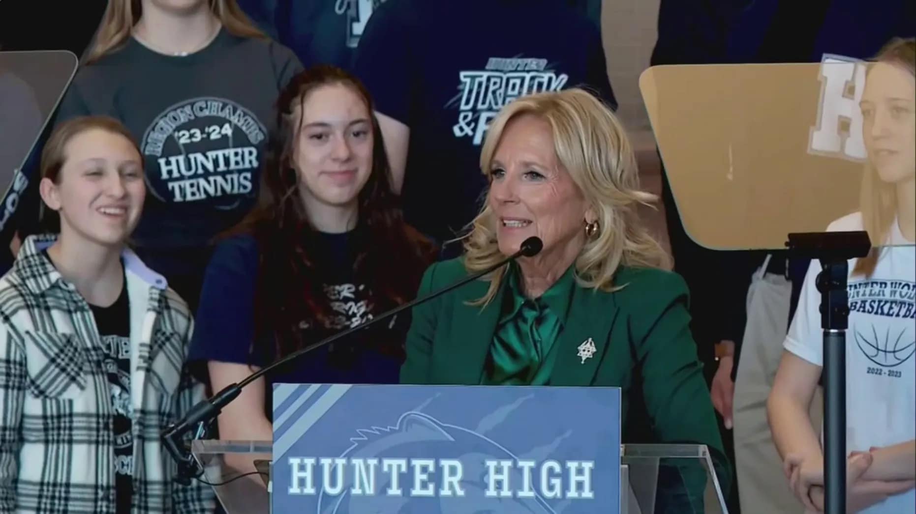 Jill Biden speaking at a podium that says Hunter High. pic.twitter.com/sjhWGjEg5L