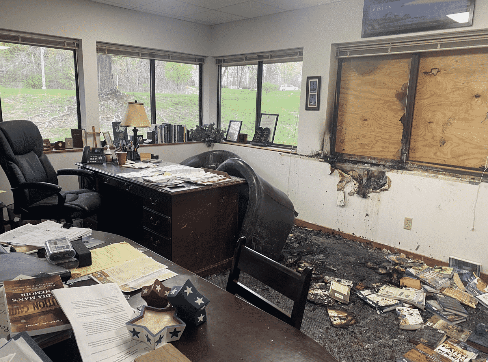 According to Fox News, “Local reporters from outlets including WISC-TV, the Wisconsin State Journal and Milwaukee Journal Sentinel said they visited the office for Wisconsin Family Action on Sunday and shared photos and videos of the apparent arson attack. A shattered window had since been boarded up, and images showed fire damaged furniture and burned books littering the floor of the office.”