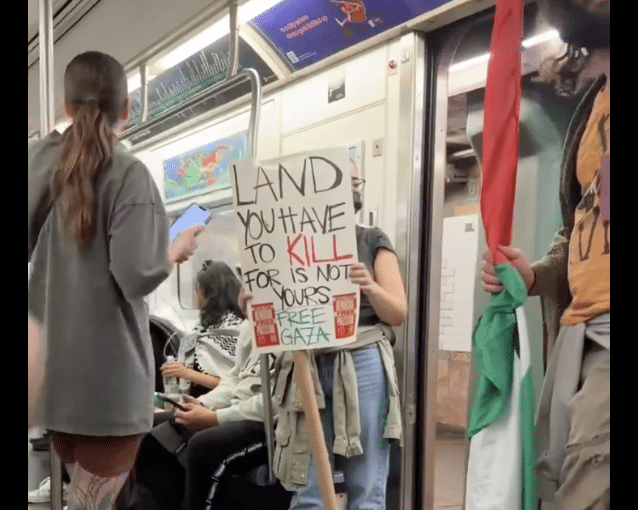 Pro-Palestinian activists swarmed a New York City subway car this week, screaming and stomping as they spewed antisemitic chants.