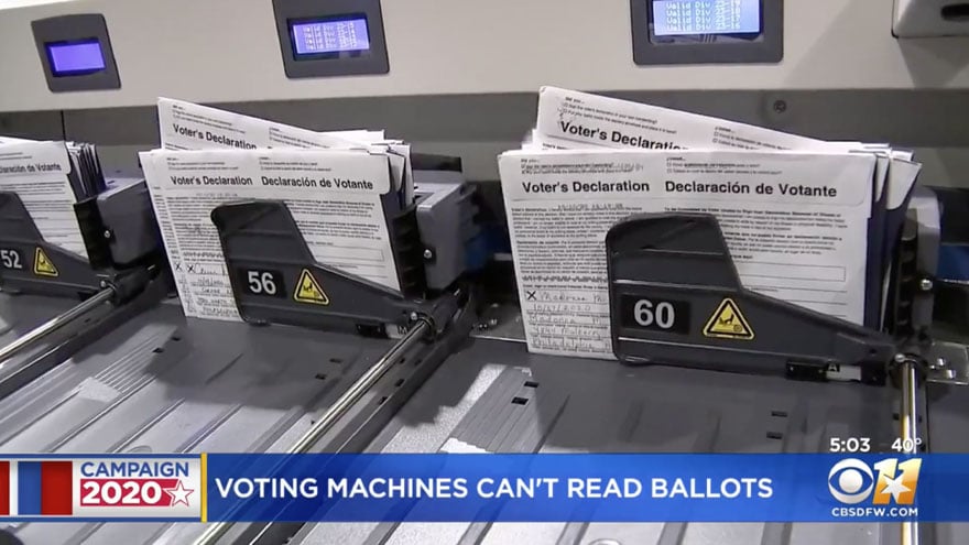 “Ballot scanning machines are rejecting about one-third of mail-in ballots returned by voters in Tarrant County. The problem has impacted more than 22,000 ballots so far,” reports CBS News Dallas. “Ballot board members are now working in 12-hour shifts to accurately replicate the ballots so they can be counted.”