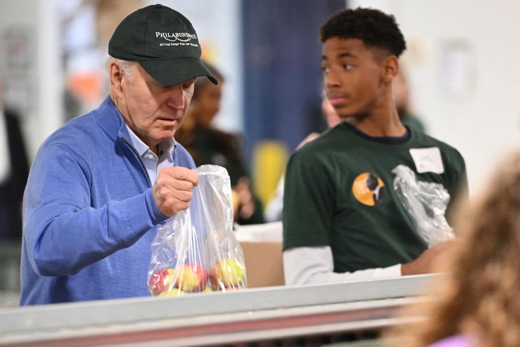 “Where do you want me?” Biden said as he picked up a bag of apples and donned a Philabundance hat.