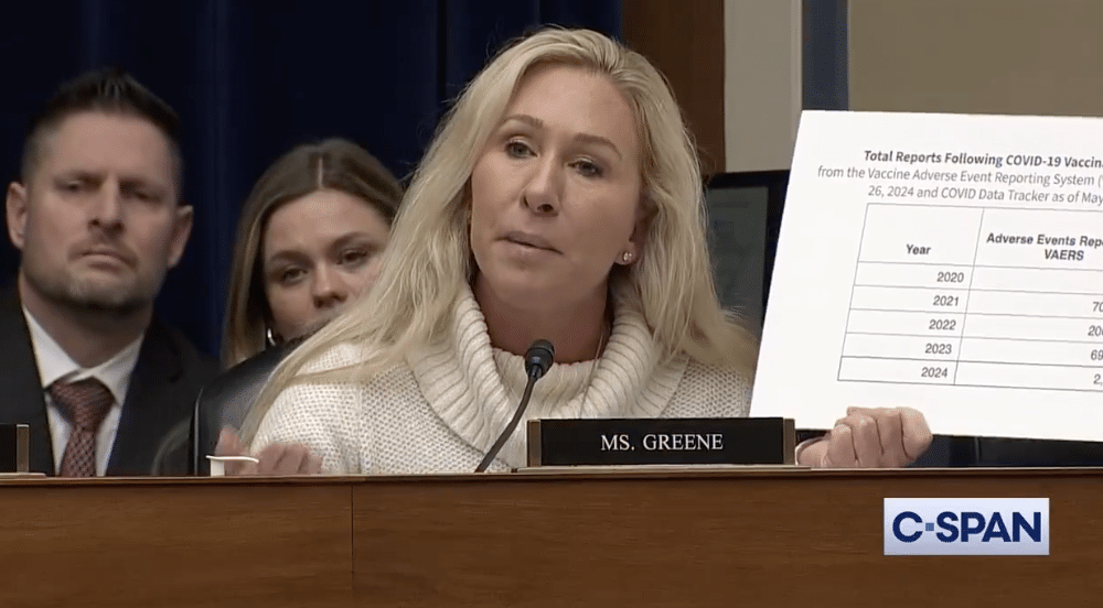 “I’m not a doctor but I have a PhD in recognizing bulls–t when I hear it,” MTG said, kicking off her time. Greene went on to give a voice to people who had been harmed in vaccination trials, some of whom were in attendance for the hearing.