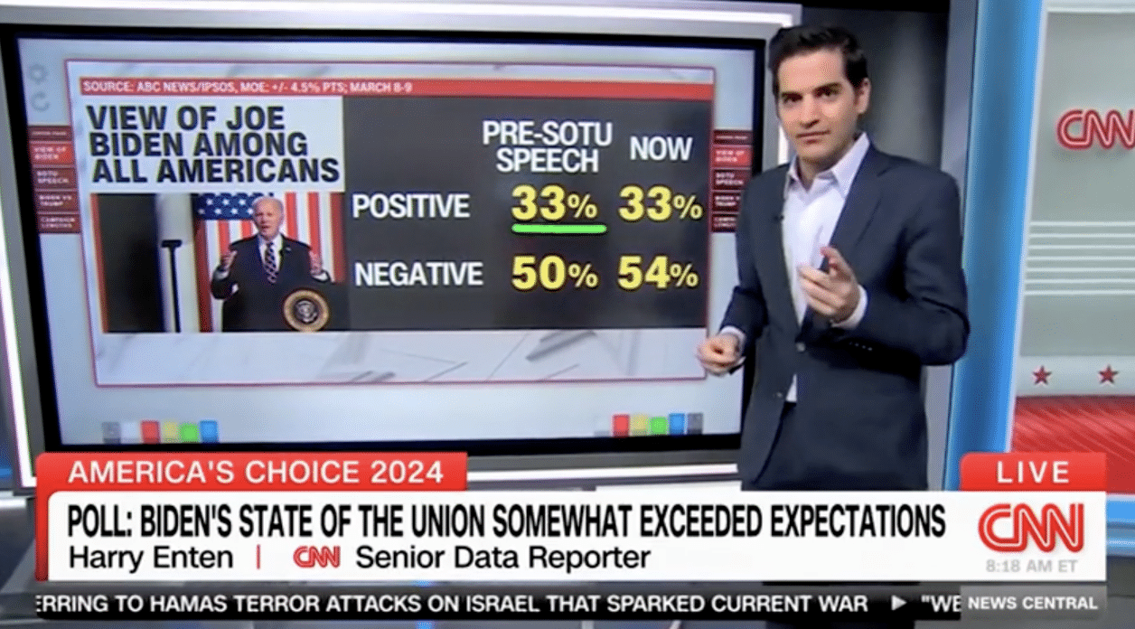 CNN analyst Harry Enten reviewed the results of an ABC News/IPSOS poll on Monday morning — it looks like President Biden didn’t get the post-State of the Union polling bump he so desperately needed.