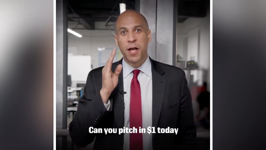“Hello everybody, it’s Cory Booker speaking to you from our campaign headquarters in Newark, New Jersey. I’m asking for your help. We need folks to chip in $1. Can you pitch in $1 today to help us make sure we continue to have the resources we need to field a full team in this campaign?” asked Booker.