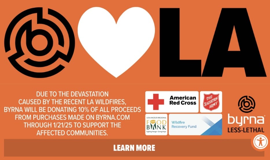 Due to the devastation caused by the recent LA wildfires, less-lethal self-defense company Byrna will be donating 10% of all proceeds from purchases made on Byrna.com through 1/21/25 to support the affected communities.