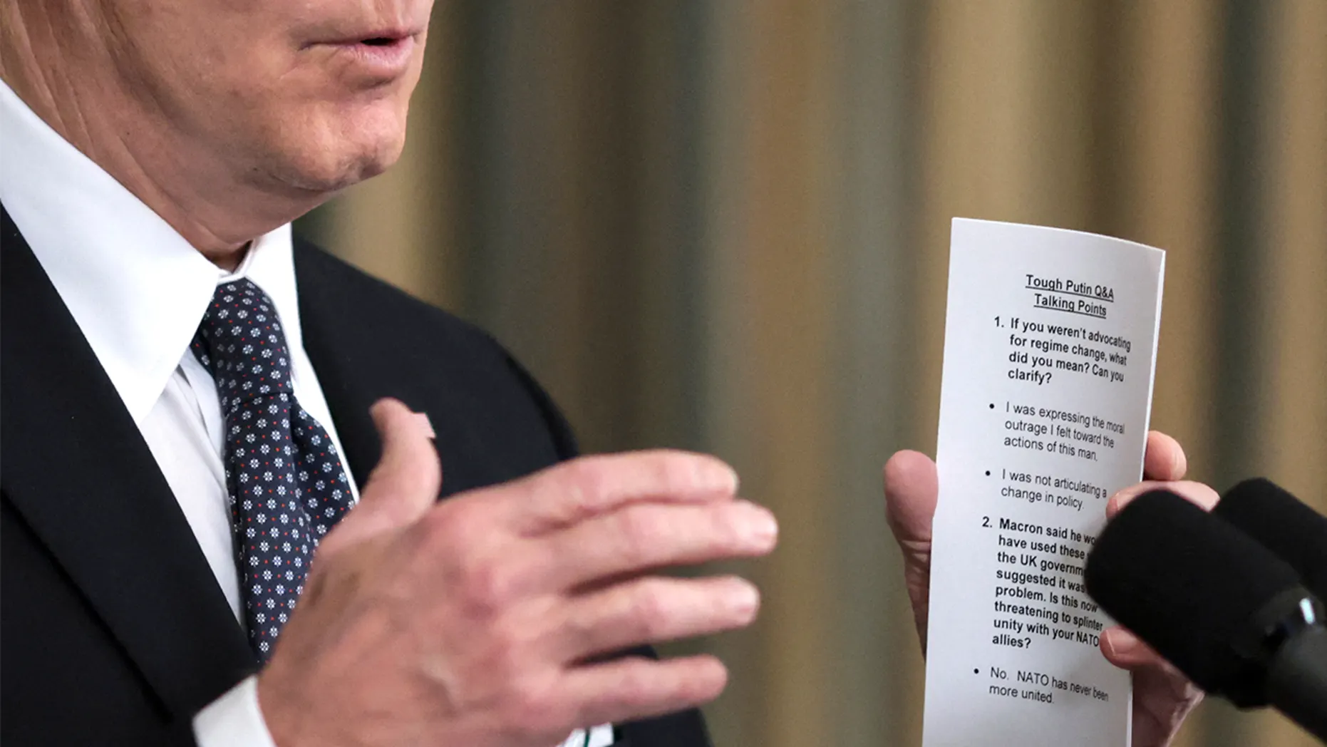 According to Fox News, President Biden “held a ‘cheat sheet’ of prepared answers for a key question during his White House news briefing Monday – a question about why his remarks on Saturday suggested support for regime change in Russia.”