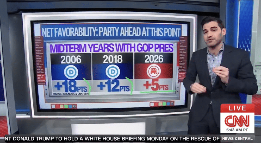 The CBS News/CNN data marks the first time in recent cycles that the president’s party enters midterms with a positive net favorability. Enten pointed out that Democrats held +18 in 2006 and +12 in 2018 when facing Republican White House incumbents.