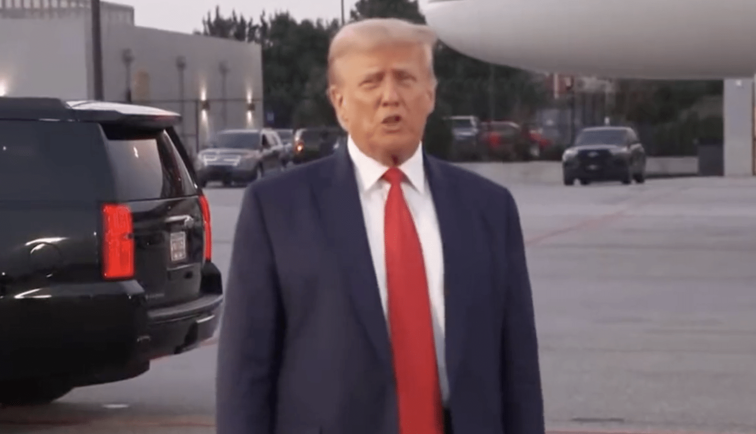 After being arrested and processed at Fulton County Jail in Georgia, former President Donald Trump spoke with reporters on the tarmac on his way out of the Peach State.