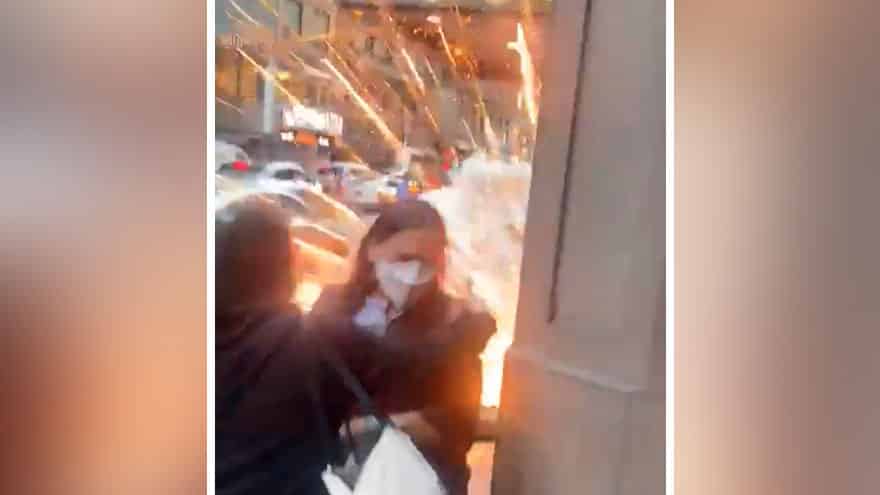 Video emerged Friday allegedly showing pro-Palestinian activists throwing an “explosive device” at Jewish-Americans walking the streets of midtown Manhattan.