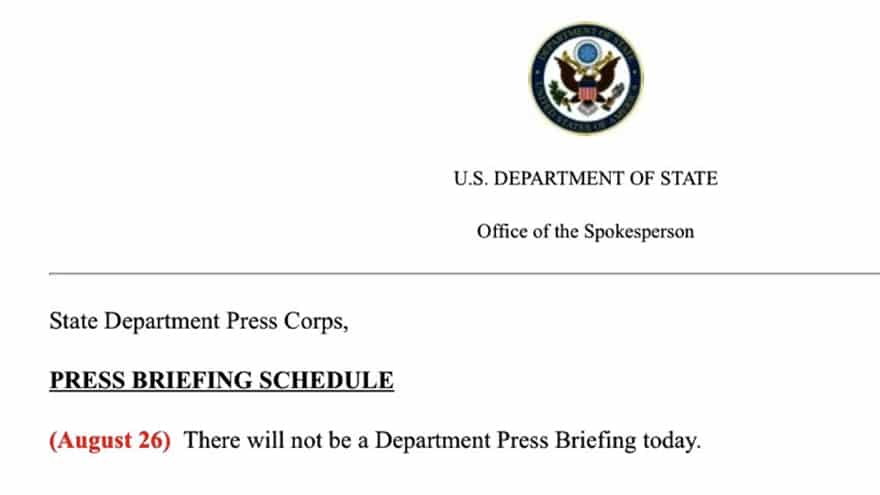 The State Department confirmed there will be no press briefing from the agency today despite chaos unfolding across Kabul following a pair of terror attacks that left at least four US Marines dead and countless civilians wounded.