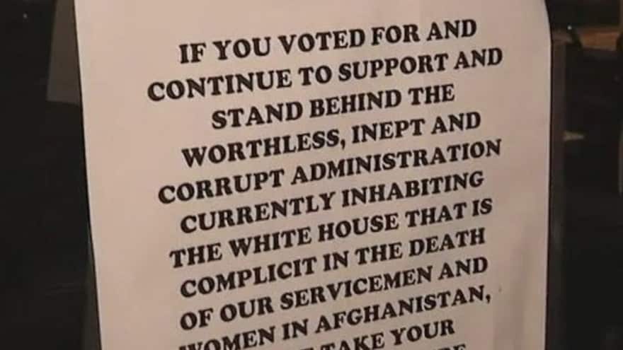 “If you voted for and continue to support and stand behind the worthless, inept and corrupt administration currently inhabiting the White House that is complicit in the death of our servicemen and women in Afghanistan, please take your business elsewhere,” stated the signage.