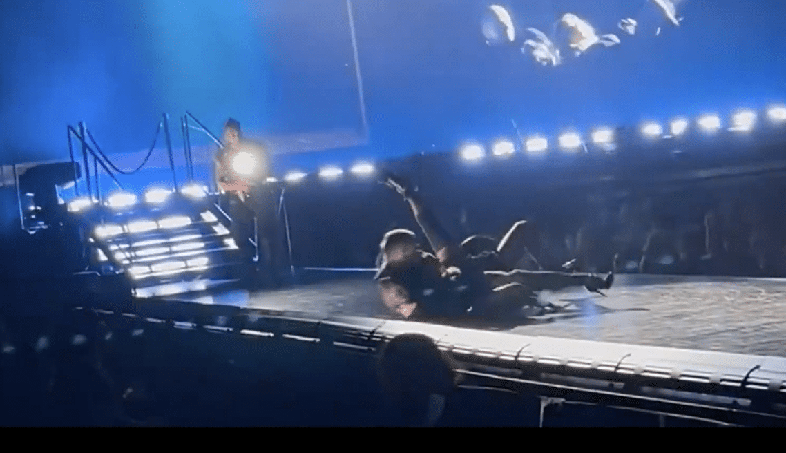 NEW: 65-year-old Madonna falls out of her chair on stage during a performance at Climate Pledge Arena in Seattle.