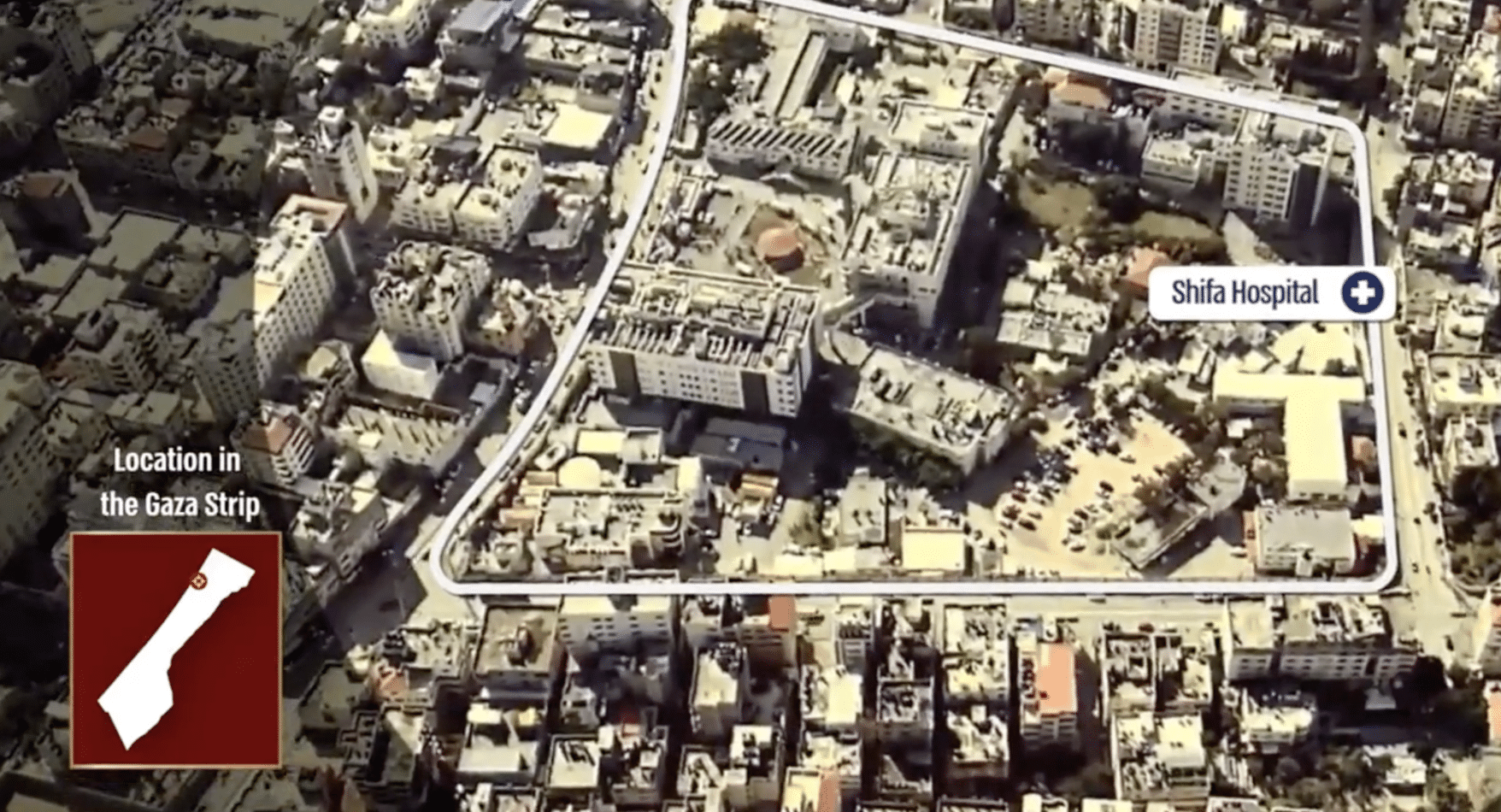 The video is titled Intelligence-based Illustration Video Regarding Hamas’ Use of Shifa Hospital Both Above and Below Ground.