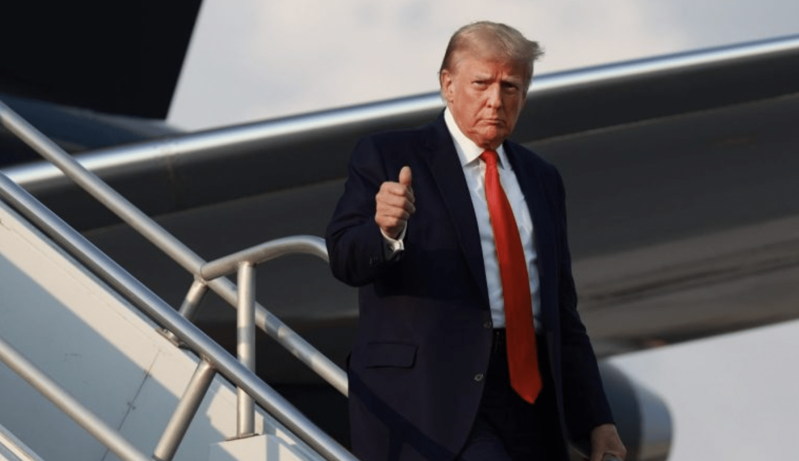 Former President Donald Trump has landed in Atlanta, Georgia, and is en route to Fulton County Jail to surrender. Trump smiled and gave a thumbs-up while leaving the plane.
